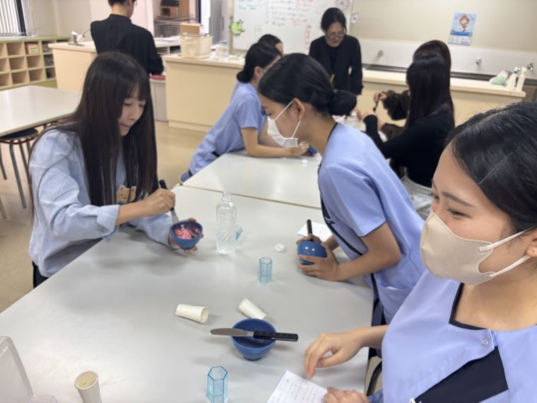 今回のオープンキャンパスでも感触あそびを体験してもらおうと、歯科材料を使って制作作りを行いました♪
